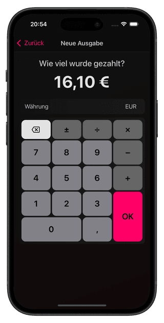Legt ein Gruppen- oder Einzelbudget fest. Die App zeigt euch jederzeit an, wie nah ihr am Limit seid und warnt, wenn ihr es überschreitet.